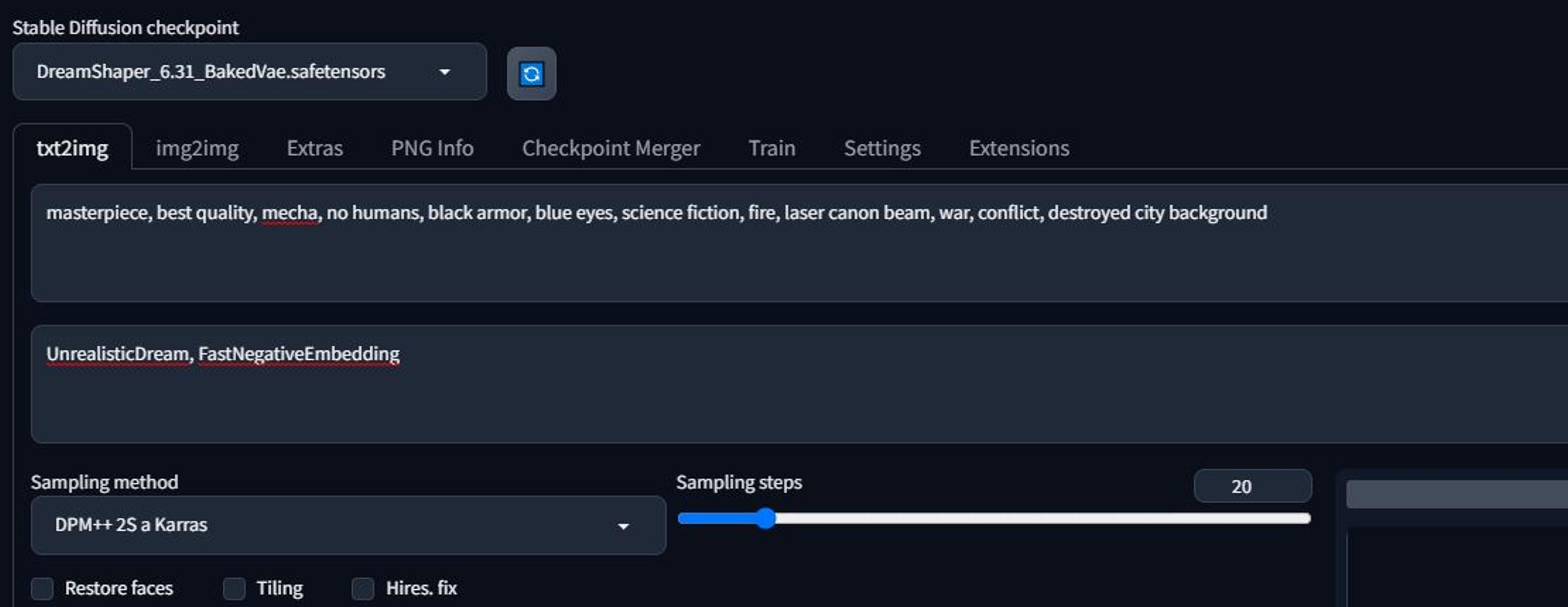 - Enter Prompt "masterpiece, best quality, mecha, no humans, black armor, blue eyes, science fiction, fire, laser canon beam, war, conflict, destroyed city background"